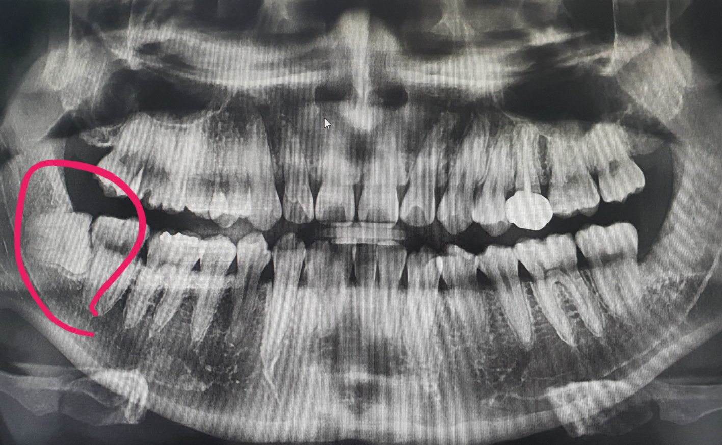 1번 이유는 왼쪽 위 사랑니에 해당하는데, 양치질만 잘 하면 위험성이 크진 않습니다.